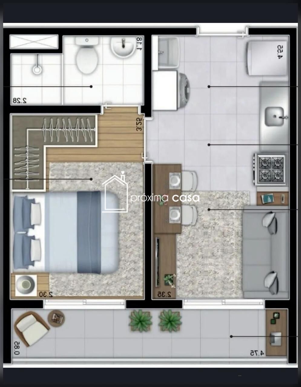 1 Dormitório1 Banheiro1 Sala de TV1 Cozinha1 Área de serviço